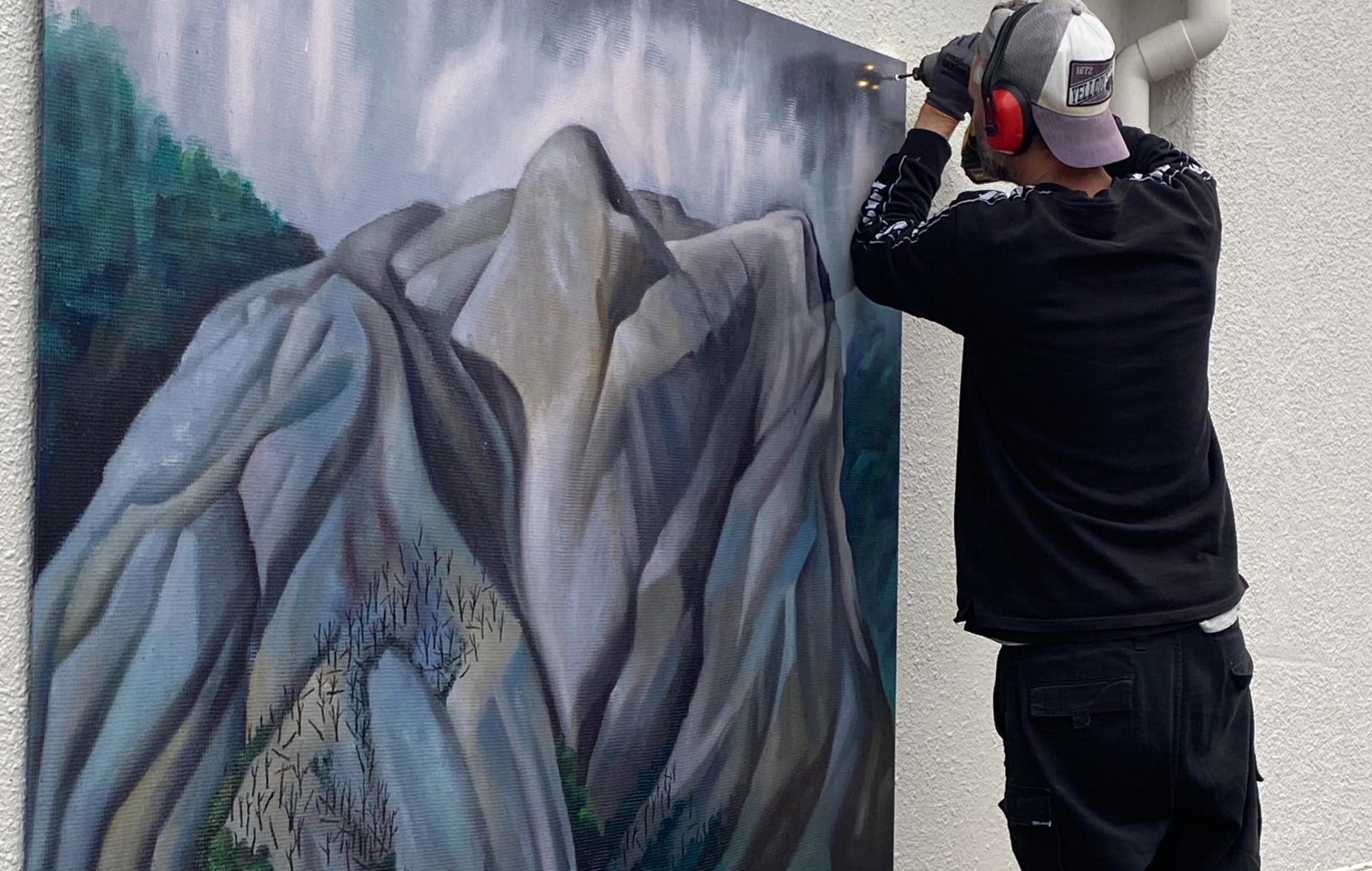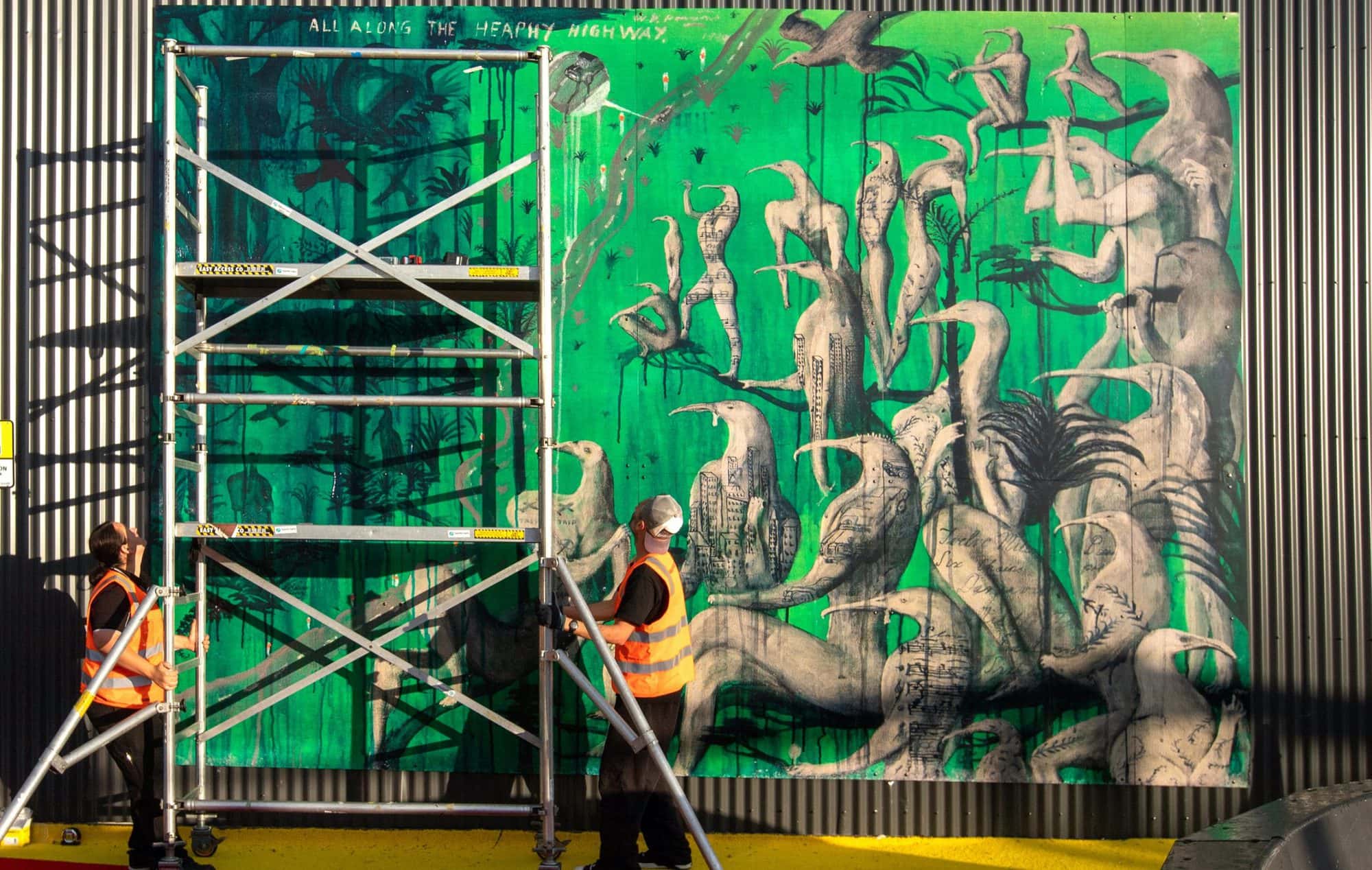 Bill Hammond’s surrealist landscape is about the controversy surrounding building a road to connect the top of the West Coast with the Nelson region, using the Heaphy Track.