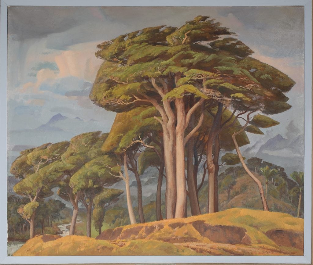 In this painting, Savage has created a quintessential Golden Bay image of limestone ridges, wind-sculpted tōtara and nīkau palms. Sunlight could be breaking through the storm clouds, but the mist hasn’t yet lifted from the valleys.