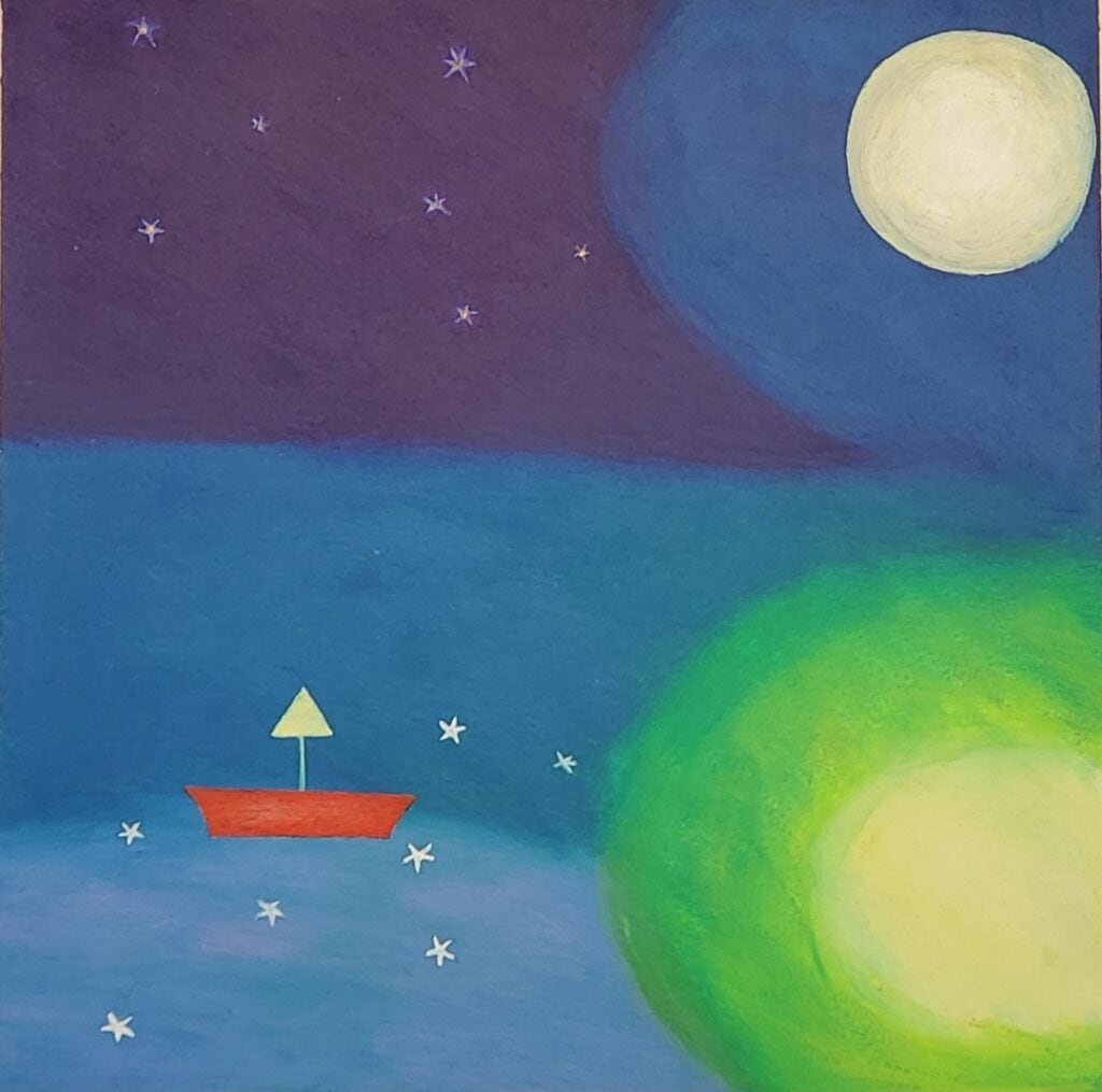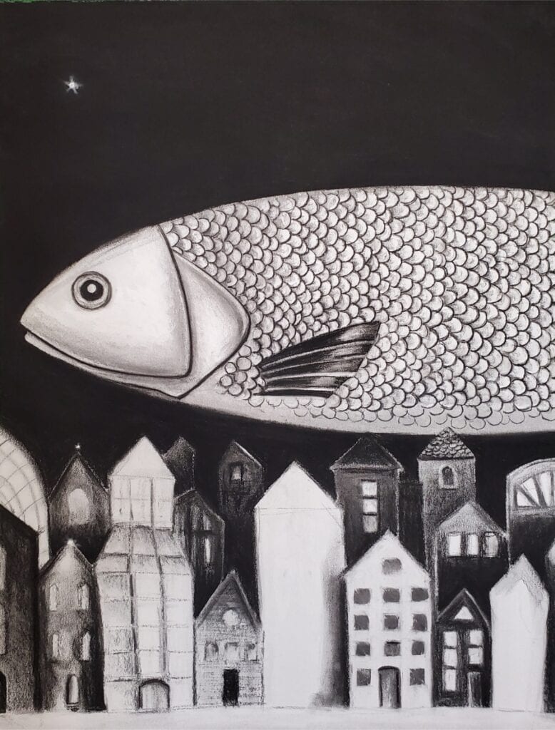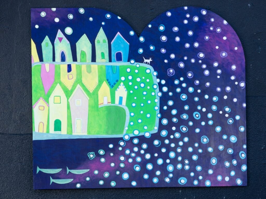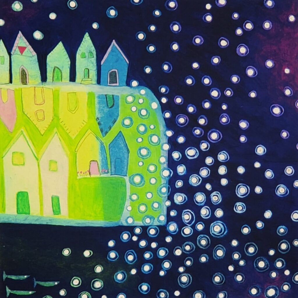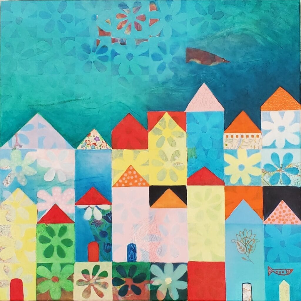 A common thread running through Allison’s work is the idea of connection to place. Largely in mixed mediums on paper and canvas with recurring motifs which include maps, the night sky, houses, fish and birds. Allison uses these motifs in the exploration of the themes of place and identity which run throughout her body of work.