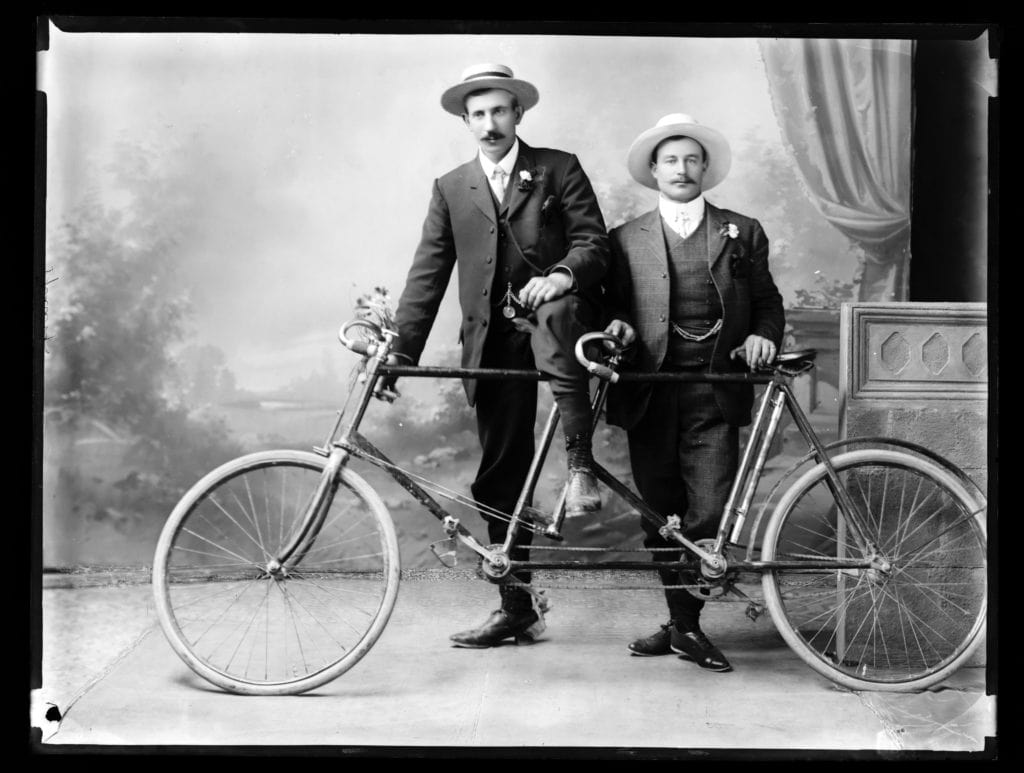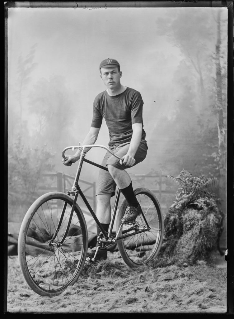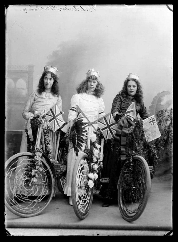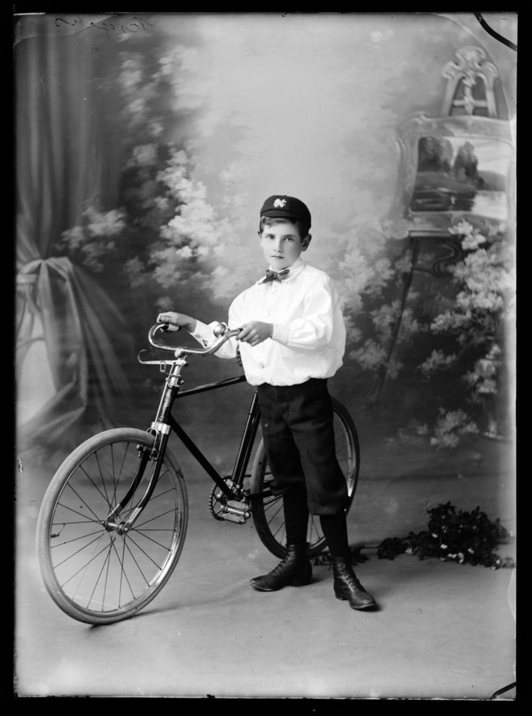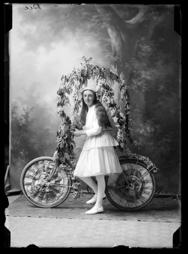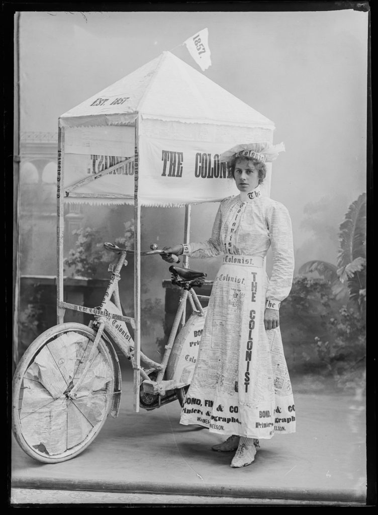 These photographs of bicycles and their proud owners are from the Nelson Provincial Museum, mostly from the Tyree Studio Collection. Operating from c.1882–1947, Tyree Studio was established by William Tyree, later joined by his brother Frederick. The business was then sold to their manager, Rosaline Frank. They specialised in studio portraits and recording civic occasions in Nelson (such as the Daffodil Parade, which featured decorated bicycles).