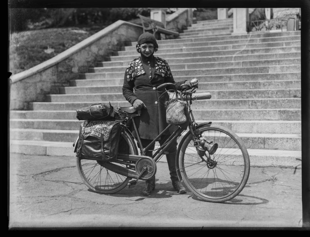 Nita Rosslyn was known in the 1930s as ‘the girl in red’ or ‘the red rider’ for her striking scarlet outfit and matching red bicycle. Pictured here in front of Nelson’s Church Steps, this intrepid traveller set out from Manchester, England, in 1930, to cycle around the United Kingdom. She then undertook a world tour, which included New Zealand and Australia. She funded her venture with over 5,000 singing and speaking engagements along the way.