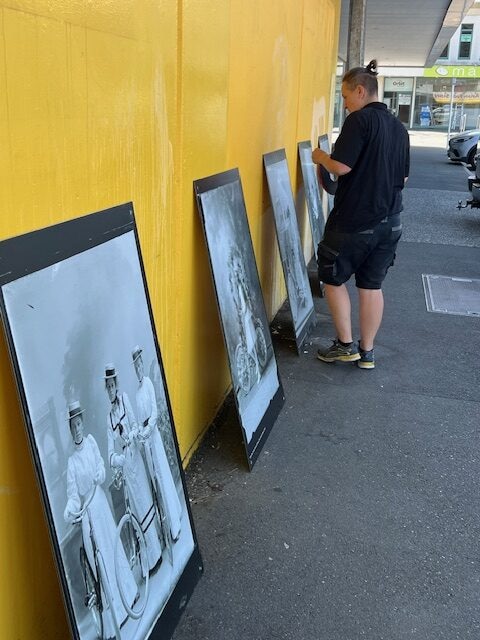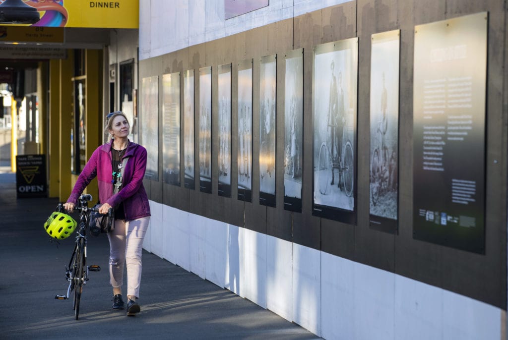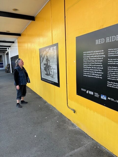 This project was first installed on hoarding for a building site on Hardy St, from May 2022 to Sept 2003. Then the panels sat in storage for a year, waiting for the right site to come to the fore. We think it was well worth the wait! So now, on the old Briscoes building, looking out over Montgomery Square, we once again have our stunning line-up of cyclists, alongside one of New Zealand’s more intriguing visitors, Nita Rosslyn.