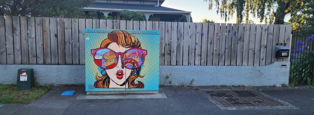 Another recent example of her work includes a mural for the Arts Council Nelson’s Chorus Cabinet initiative. Amy’s artwork, Rose-tinted Choices, is at 102 Milton Street. There’s more info about Amy’s Chorus Box here. And for a fun little challenge, you can do an online puzzle of Rose-tinted Choices here – warning – it’s addictive!