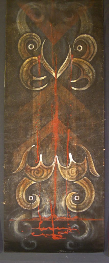 This painting depicts the origins of kōkōwai, a stone that is ground to make a red ochre pigment, and which, when applied, can denote tapu (sacredness). Ranginui (Sky Father) is separated from Papatūānuku (Earth Mother), creating the world of light and humankind. The wounds inflicted on Papatūānuku result in the creation of kōkōwai.