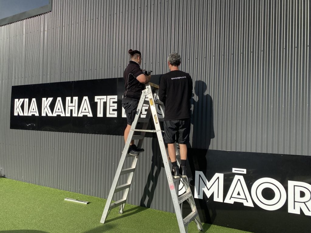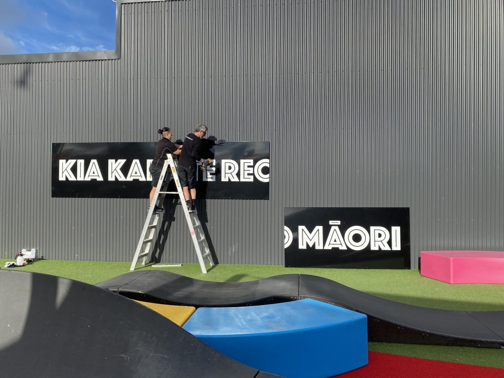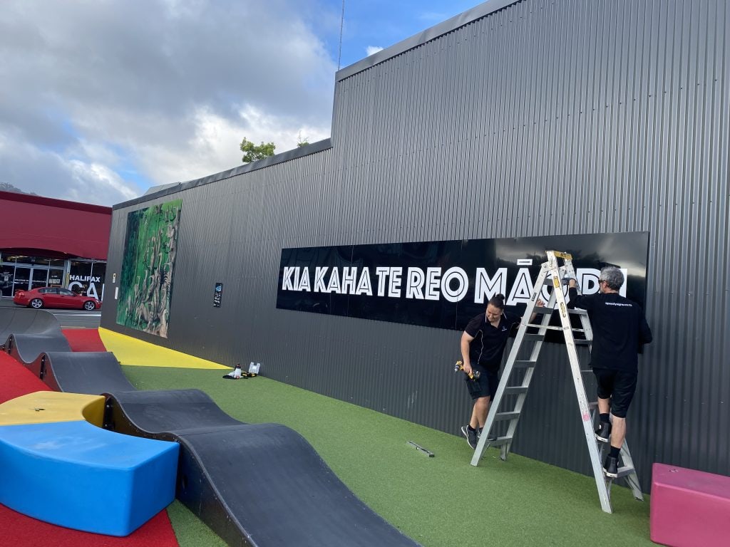 In 2019, 2020 and 2021 MakeShift Spaces and Nelson City Council have worked together to celebrate Te Wiki o te Reo Māori. The 2021 messaging near Elma Turner Library is still there for 2022. It was originally along Halifax Street (13 Sept – 15 Oct 2021), and then moved to opposite external walls of the Library (20 Dec 2021), so that Kia Kaha Te Reo Māori now looks over Riverside Pop-Up Park, and the pronunciation guides are on the wall facing onto the Library carpark. Ka rawe!