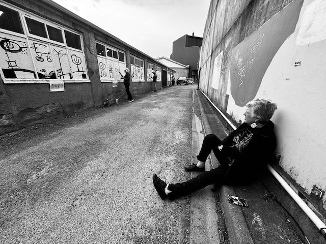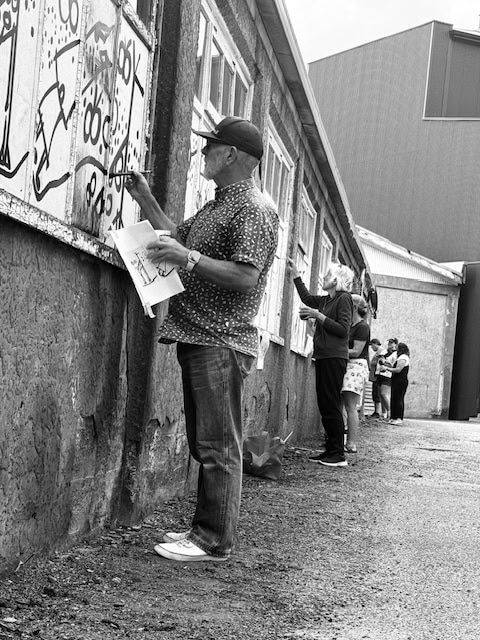 The symbols are based on some existing graffiti that was left in place. The 48 separate black and white images are playful and connected, leading the observer down the Royal Theatre Laneway to arrive at two large colourful faces signifying the back entrance to the Theatre Royal and to Rockquest.