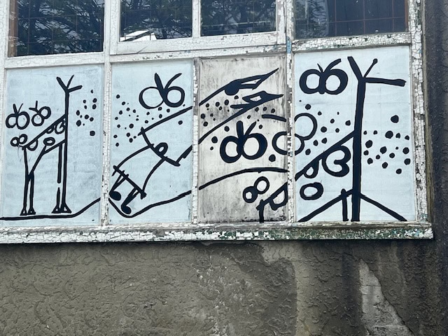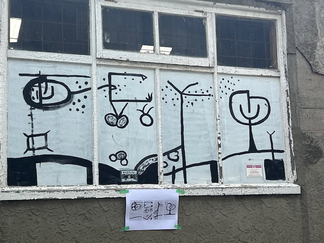 The 12 grungy white-washed windows, each divided into four portrait panes, were a new linear mural opportunity. The windows allowed natural light into an adjacent mechanic’s workshop, so a simple black line design was chosen to reduce blocking out the sunlight.