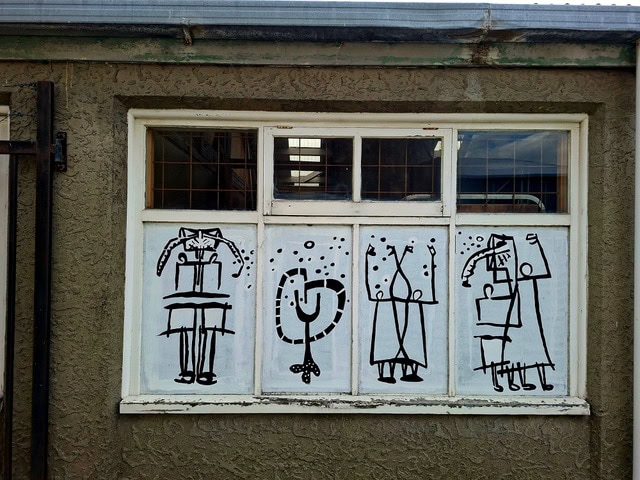 Richard Sellars did the concept designs, and 11 artists scaled them up and painted them on the windows over a single Sunday morning. The emphasis of this collaborative creative group endeavour was to produce in a free flowing, spontaneous and joyful way to bring a little ‘lift in spirits’ to a forgotten lane way.