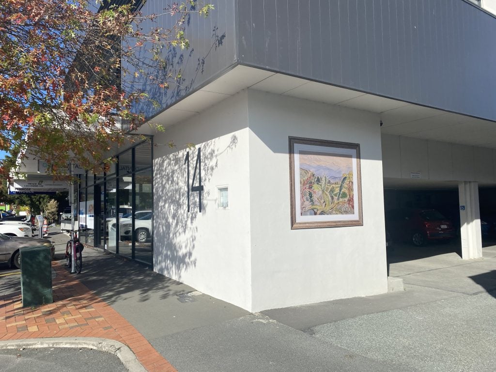 This painting is the view from the artist’s farmhouse verandah at Speargrass Station. Washbourn and her husband Gerald Goulter moved to this high-country farm in 1951. The painting includes the view looking down the valley to the Twins, part of the mountain range of the Nelson Lakes area where this farm is situated.