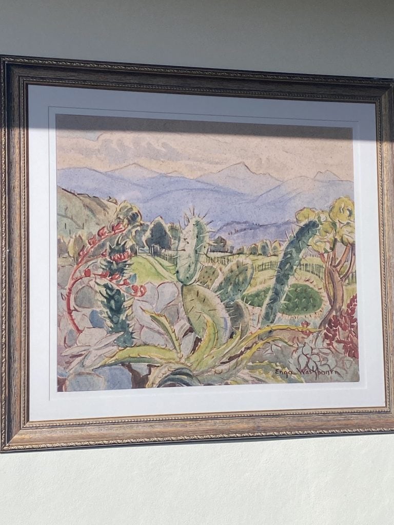 The main focus of the image is the artist’s garden. She has made a lively image full of movement using the unusual and dramatic forms of the cacti and succulent plants, which, if the painting is anything to go by, appears to have thrived in this semi-alpine environment. One of her sons recalls how he and his brother occasionally had to help ‘tidy up’ this garden – not one of their favourite chores due to the prickly spines and sharp edges of the plants.